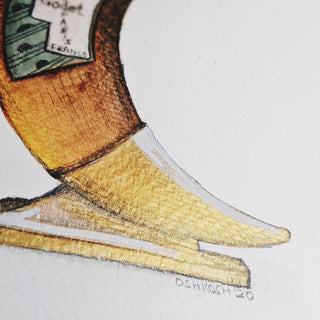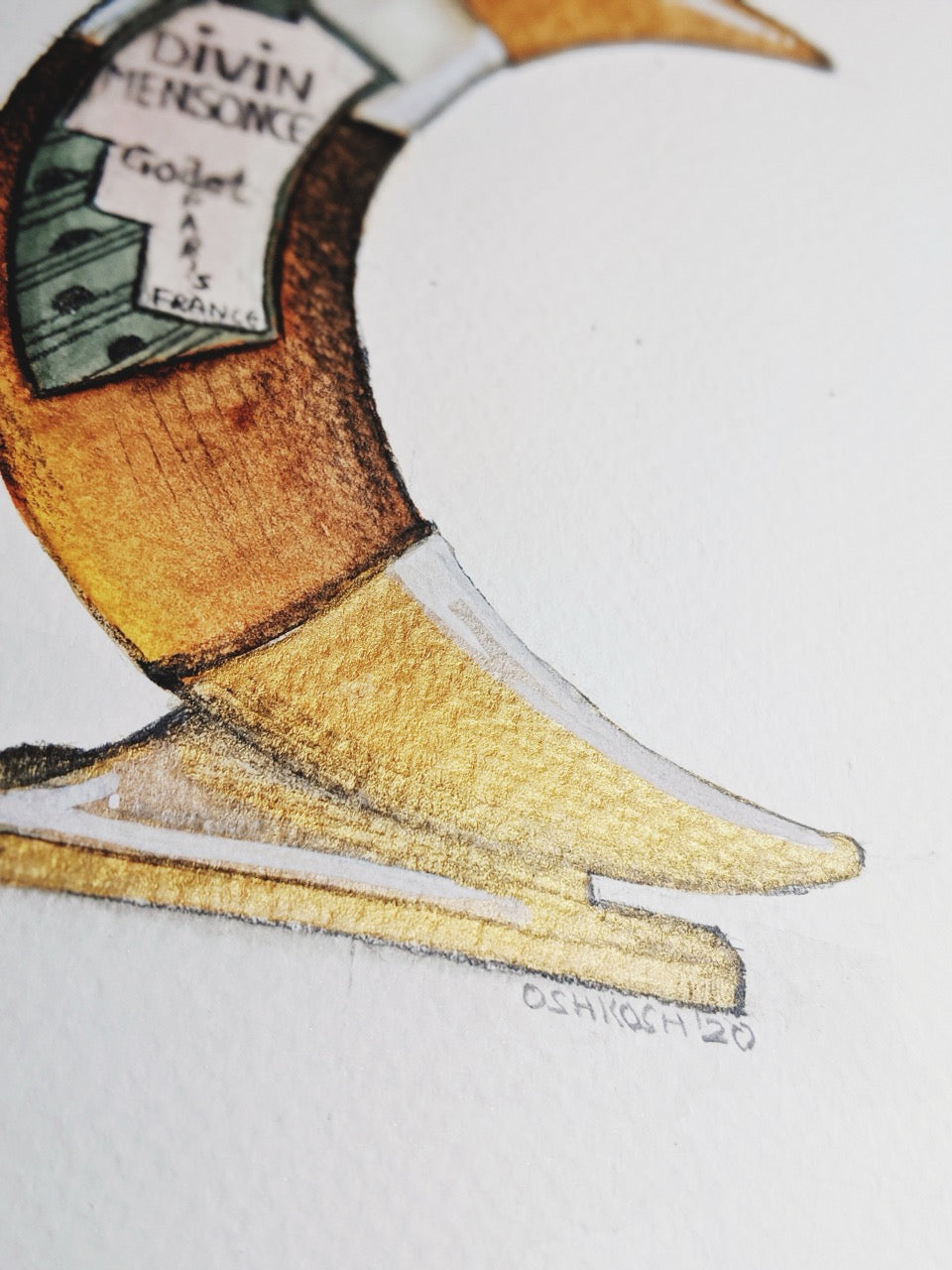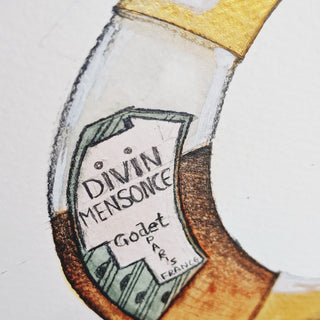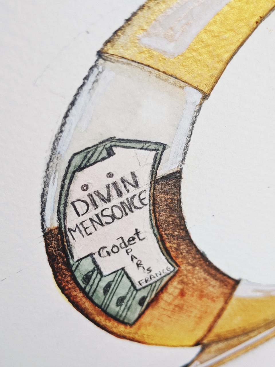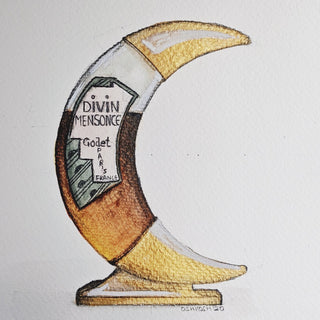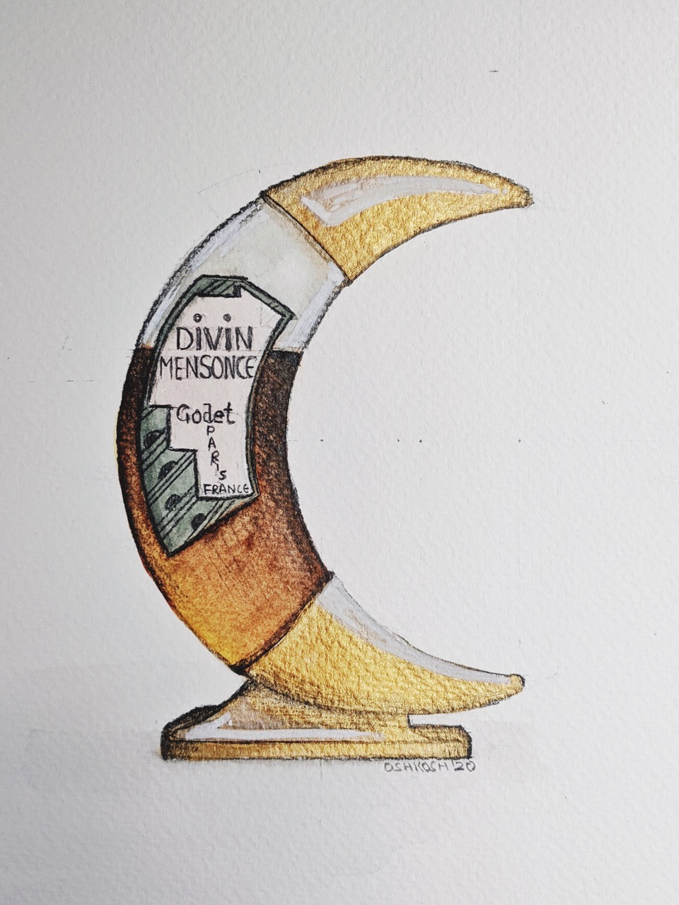 From the Scented Selves series, Divin Mensonce reimagines the iconic crescent-moon-shaped Godet Paris perfume bottle with a dreamy, celestial charm. Painted with watercolour on 300 GSM acid-free paper, the piece captures the allure of fantasy and fragrance through delicate washes, soft metallic tones, and vintage elegance. A tribute to the surreal beauty of perfume design from a bygone era.