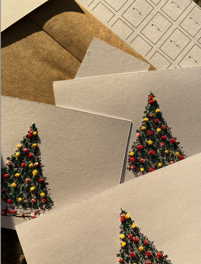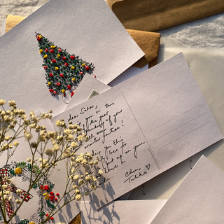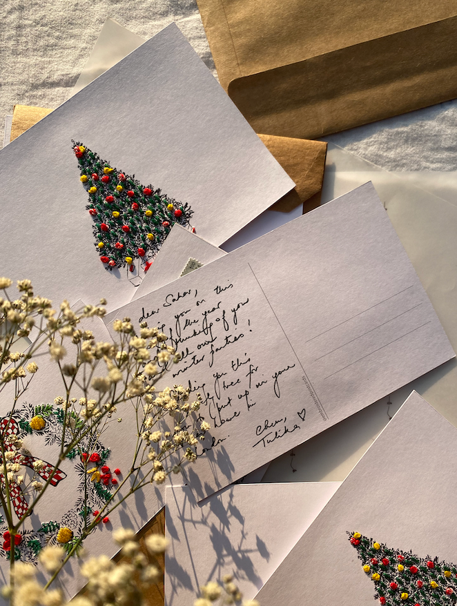 Each postcard is completely hand-crafted and hand-embroidered. Take time to feel the embroidery on paper and smell the threads for they are infused with fragrance of the flora-- take a sensory deep dive.
