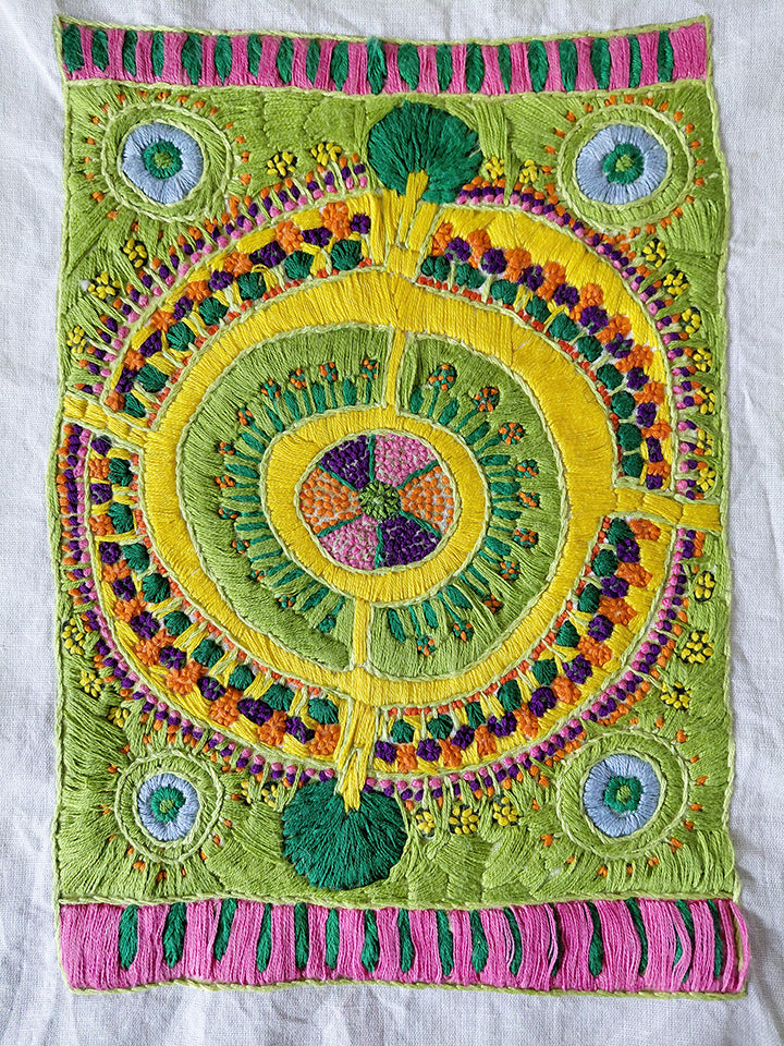 This pieces is inspired by the community garden I volunteered at a while back and has been embroidered by Preeti- one of the many girls close to my house who is learning to embroider from me and my mom. This is her very first piece.