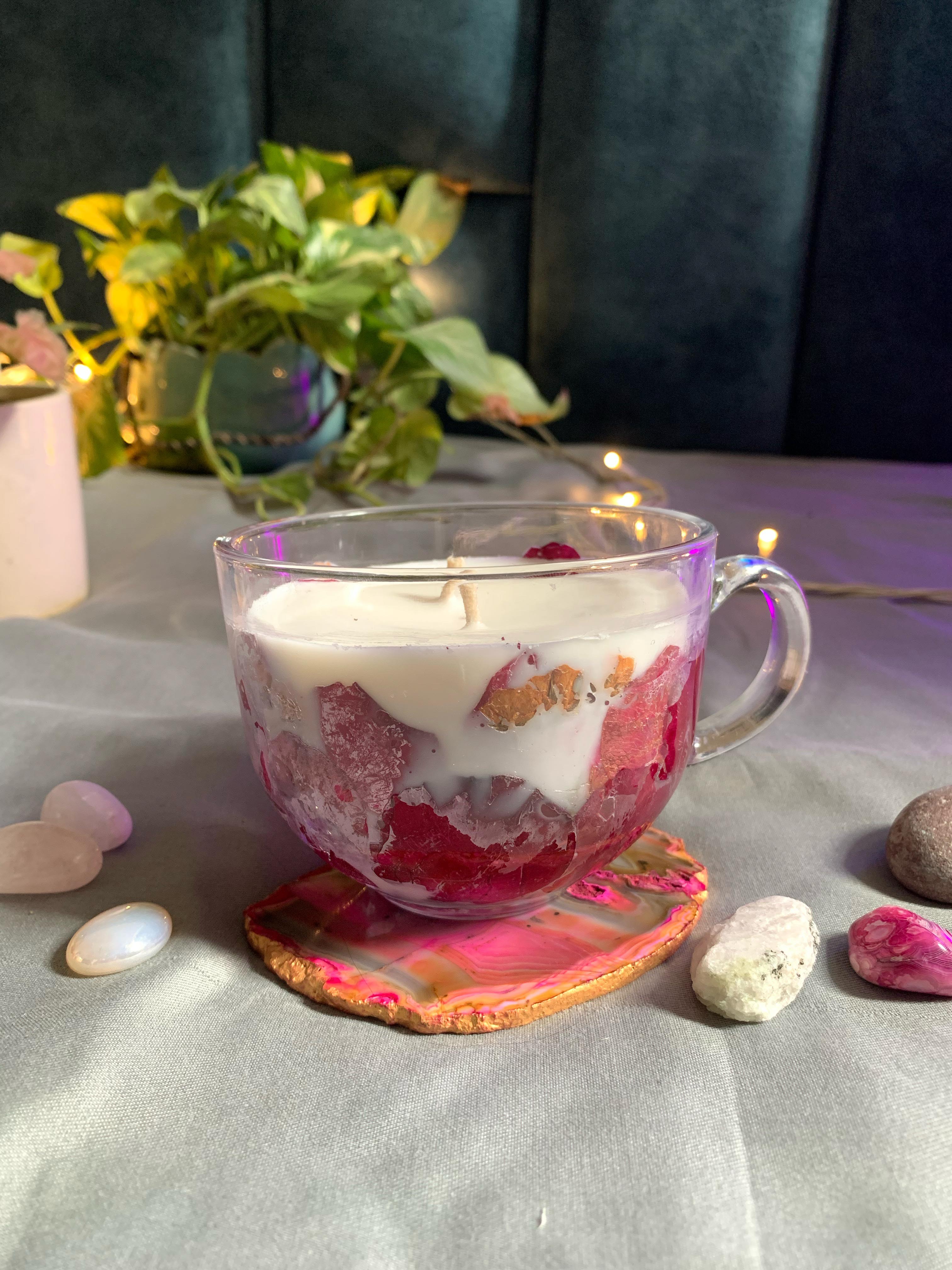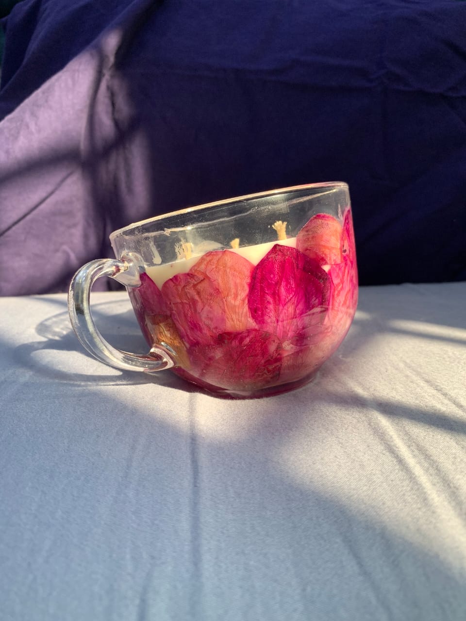This luxurious candle, nestled in a crystal-clear coffee mug, exudes elegance with its pristine white wax and pressed rose petals. The enchanting blend of rose and oud fills your space with warmth and depth, evoking the charm of a vintage love letter. Once the wax has melted, the mug transforms into your favorite companion for morning coffee.