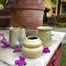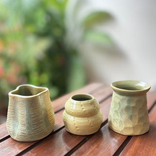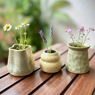 This set of 3 mini vases is the cutest thing you'll see and want to buy for yourself or for a loved one! Wheel thrown, textured and glazed in a gentle copper green glaze which has given muted tones and jewelled flares alternately, these vases are perfect for that corner you've been wanting to decorate but not sure how to, or for the bookshelf that needs a little pizzaz, or even for your office desk. They don't take much space for those who want and love decor but shy away from bulky items, but take just the right amount of attention :)