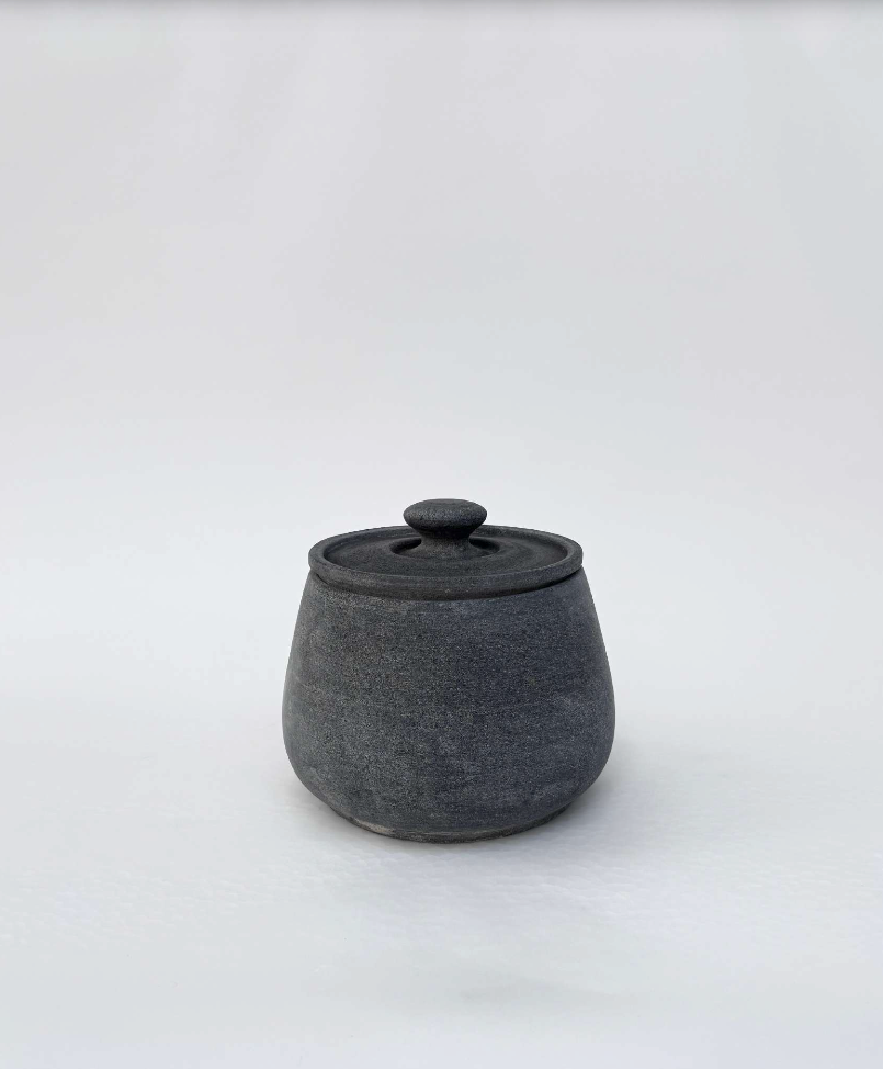 A small-sized stone jar with a fitting lid, slightly rounded body, and a small knob handle on top. Naturally insulating, stone keeps dishes warm longer and enhances flavours. Practical for the kitchen and sculptural on the table.