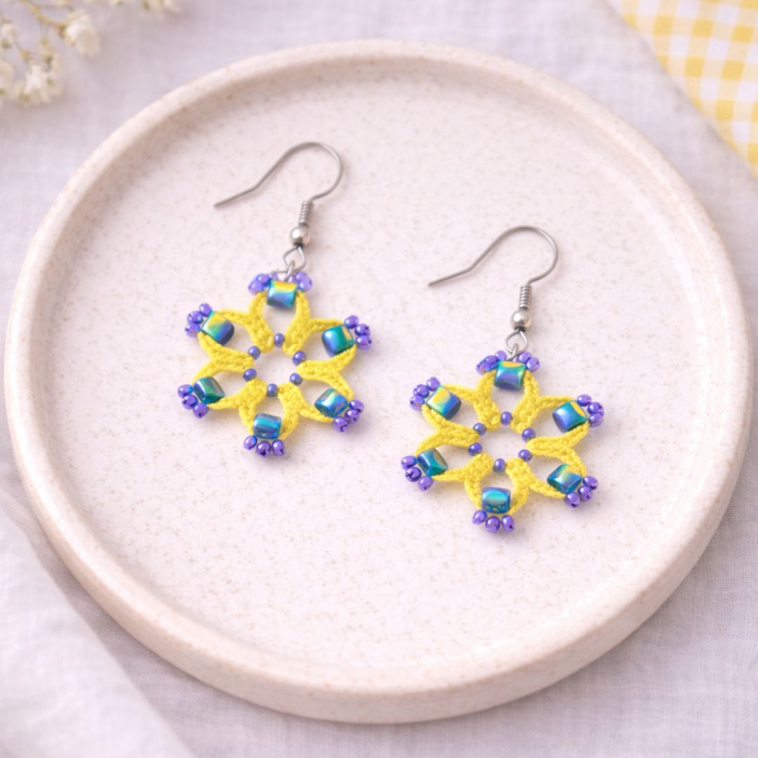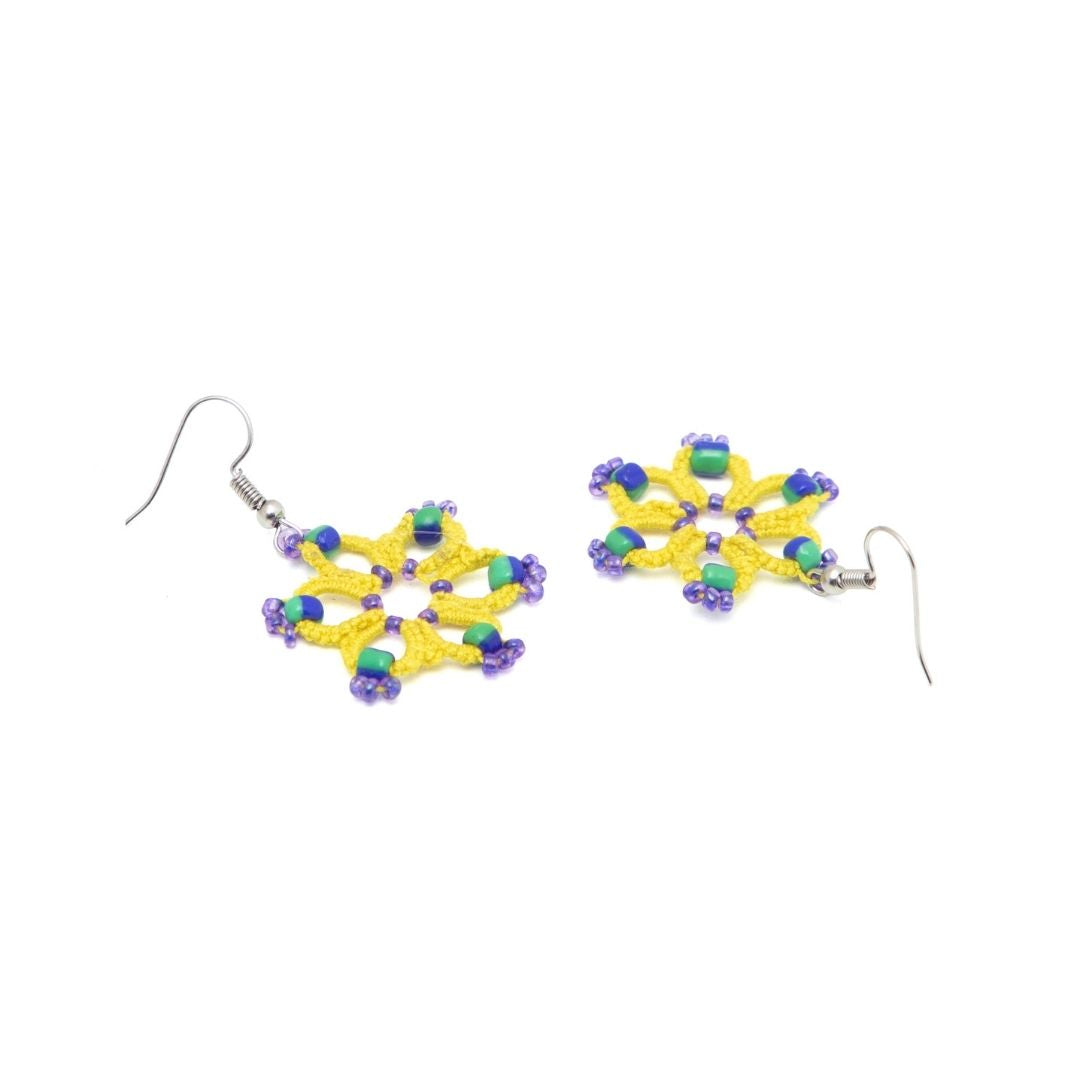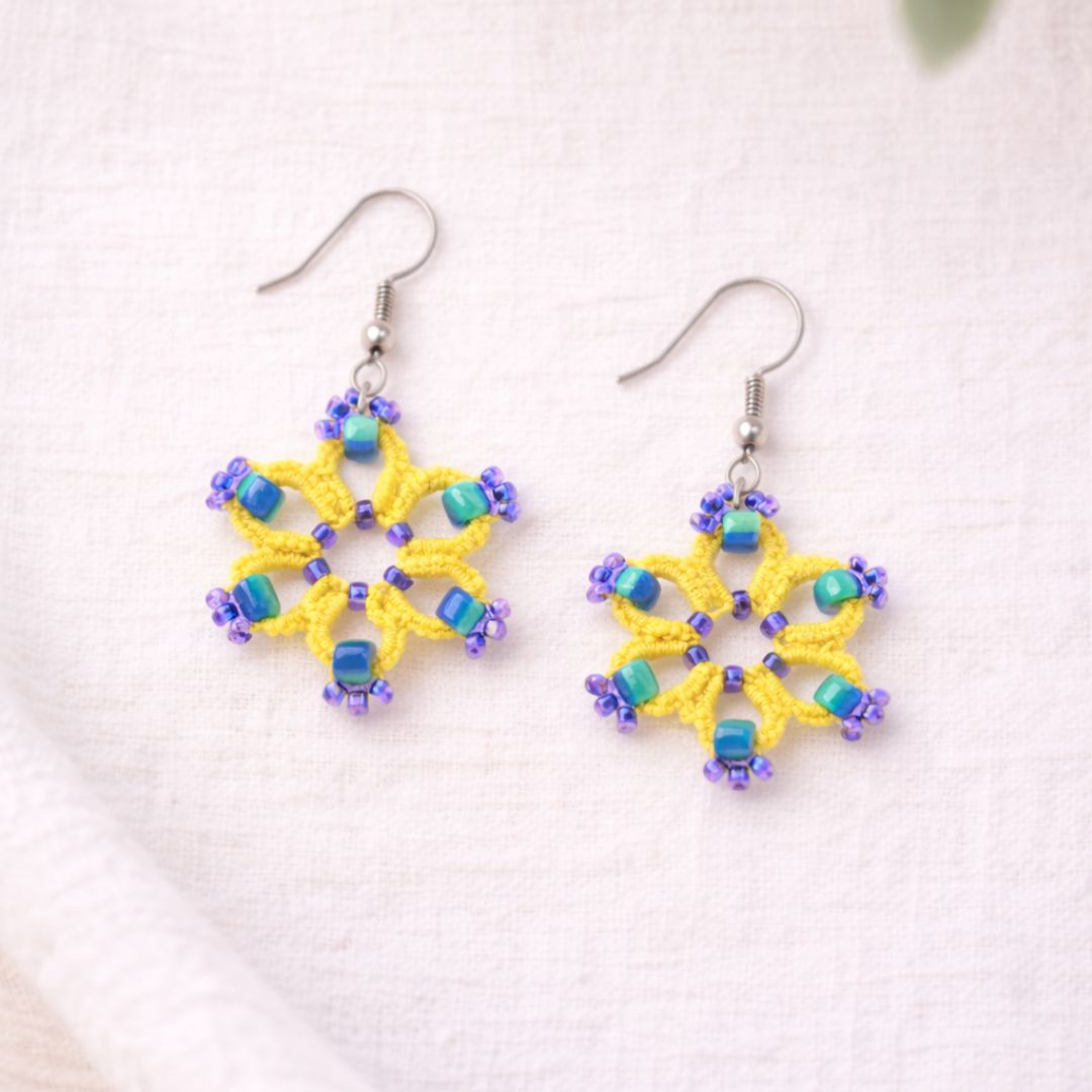Beautifully crafted with cotton thread and delicate beads using the age-old technique of tatting, these earrings feature intricate lacework created knot by knot with shuttle tatting. Handmade with great care, each pair is exclusively crafted using this traditional method. These super cool, extremely lightweight earrings are versatile enough to complement any attire, ensuring you can wear them all day with ease. As artisanal items entirely made and decorated by hand, small imperfections denote the originality of the product. So, hop on board and add a touch of artisanal charm to your ensemble! Dimensions: L 3 x W 2.2 cm (approx)