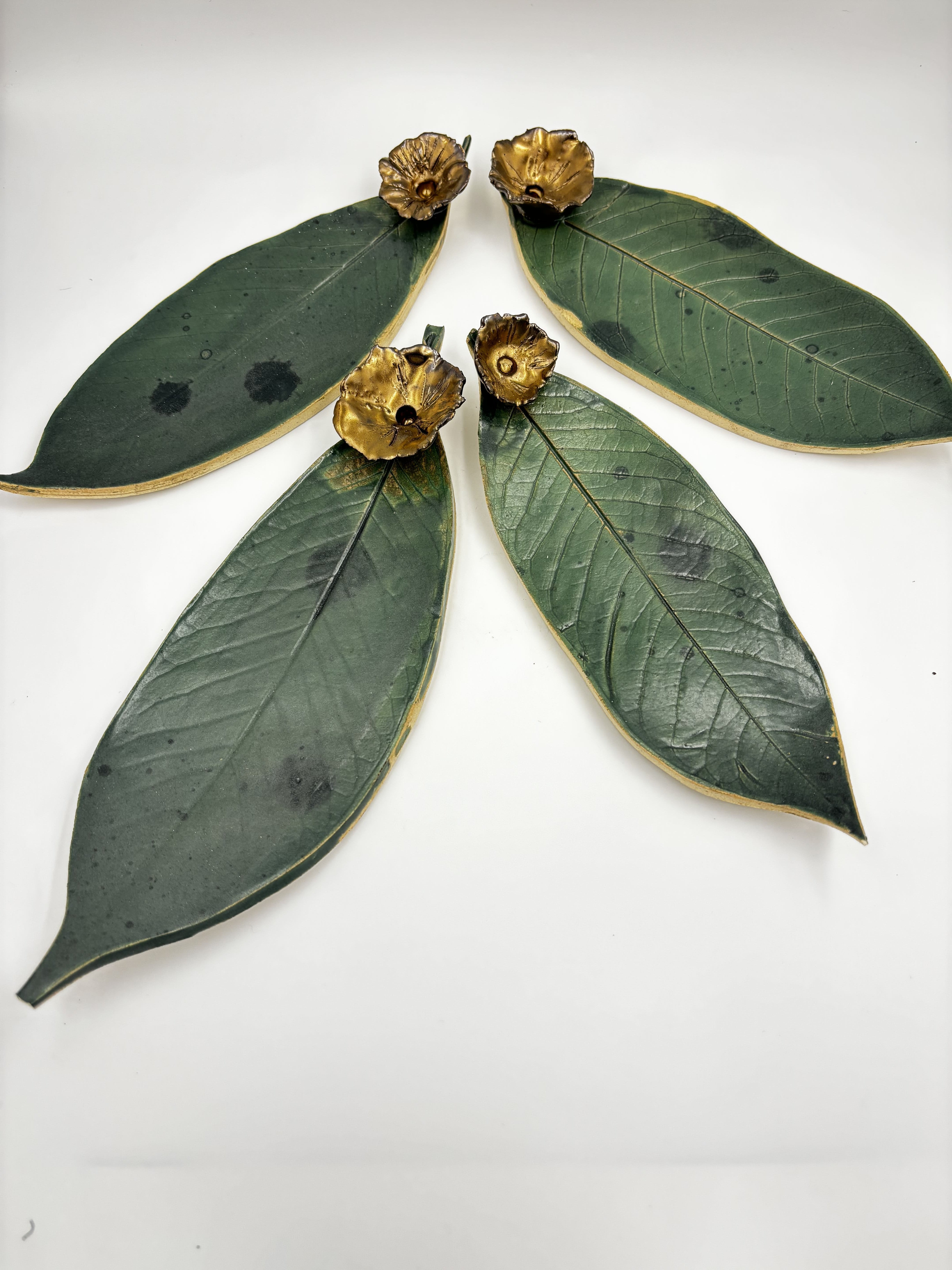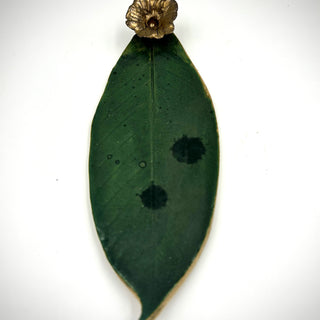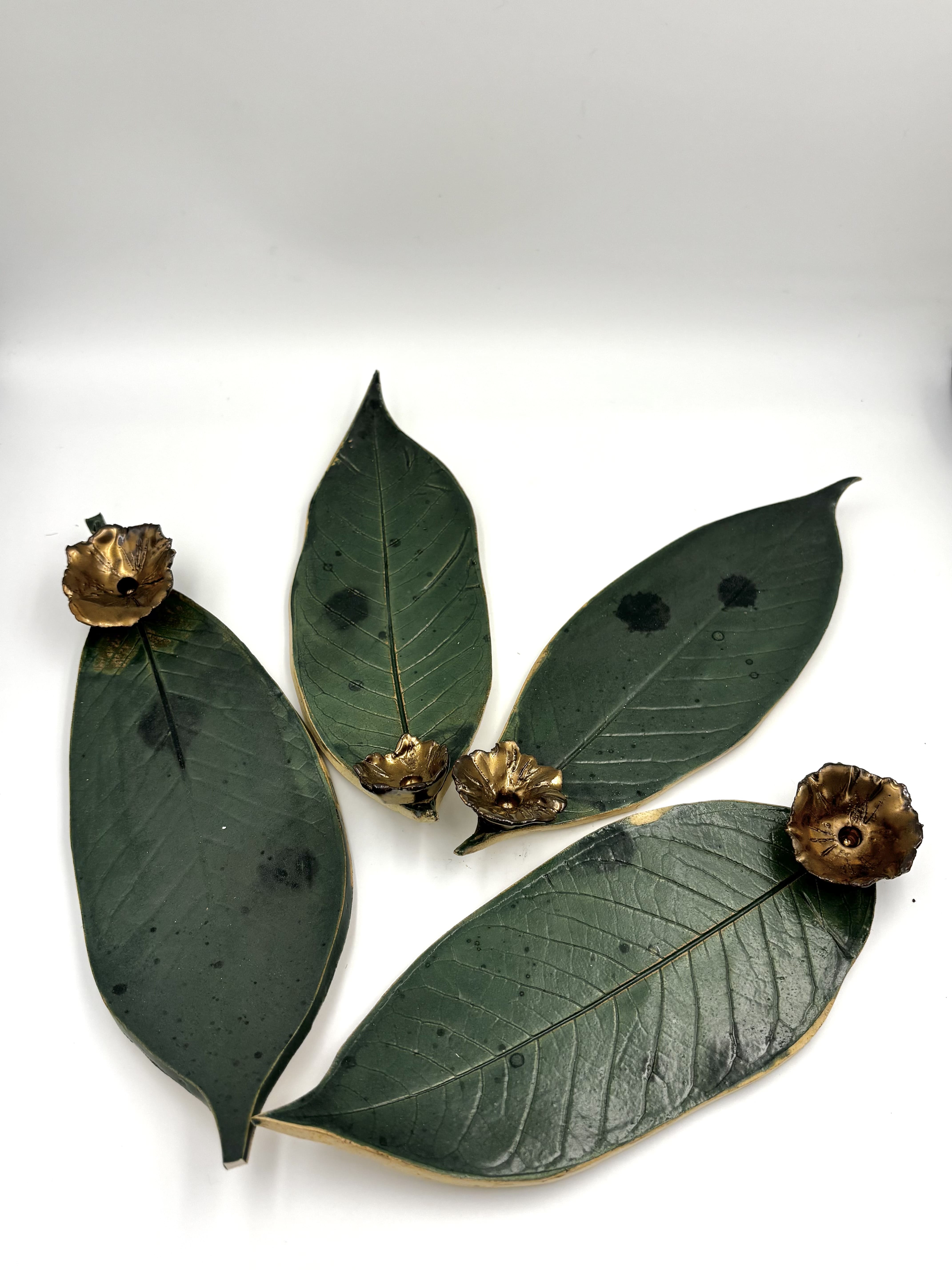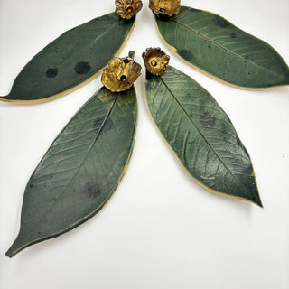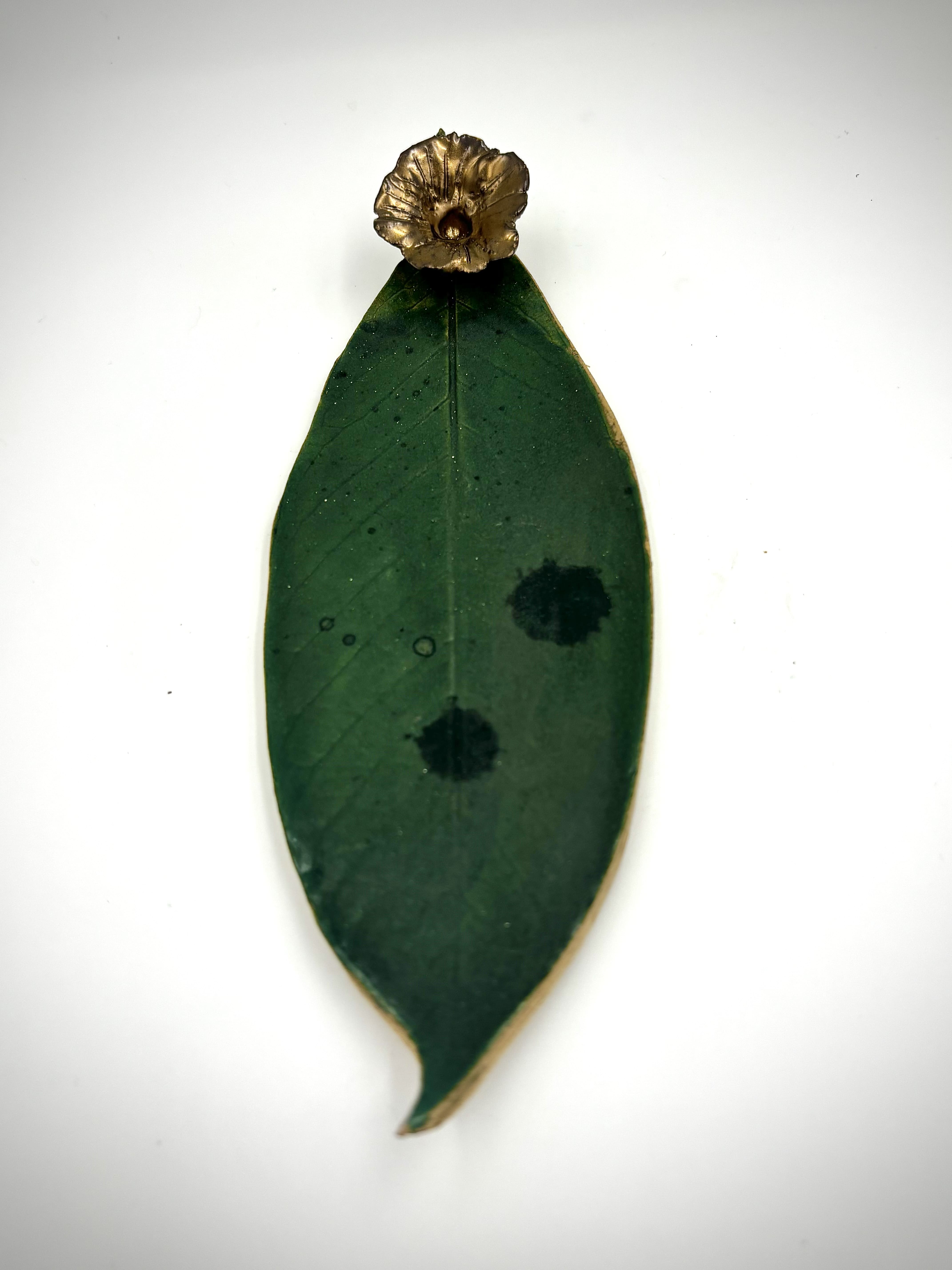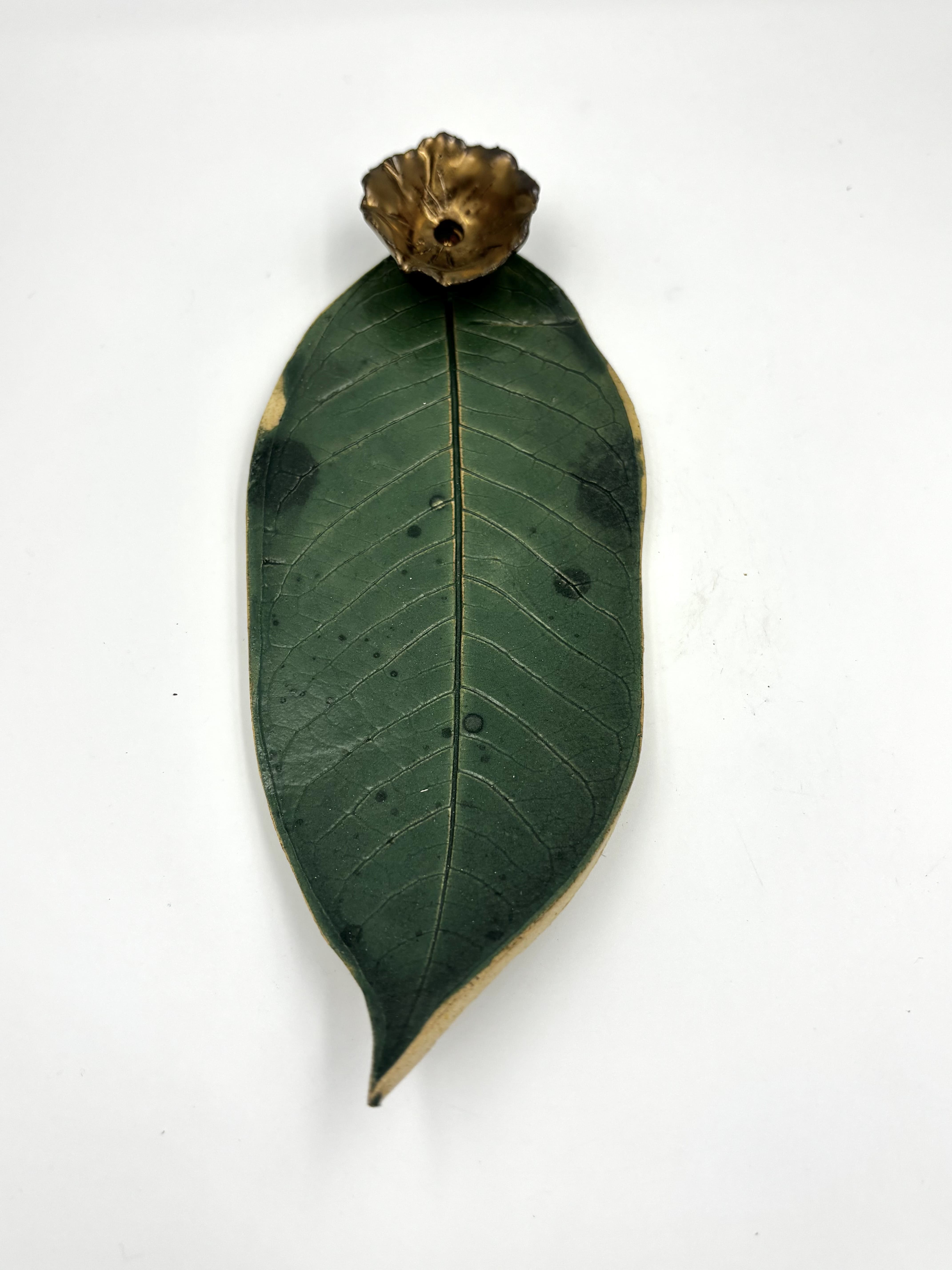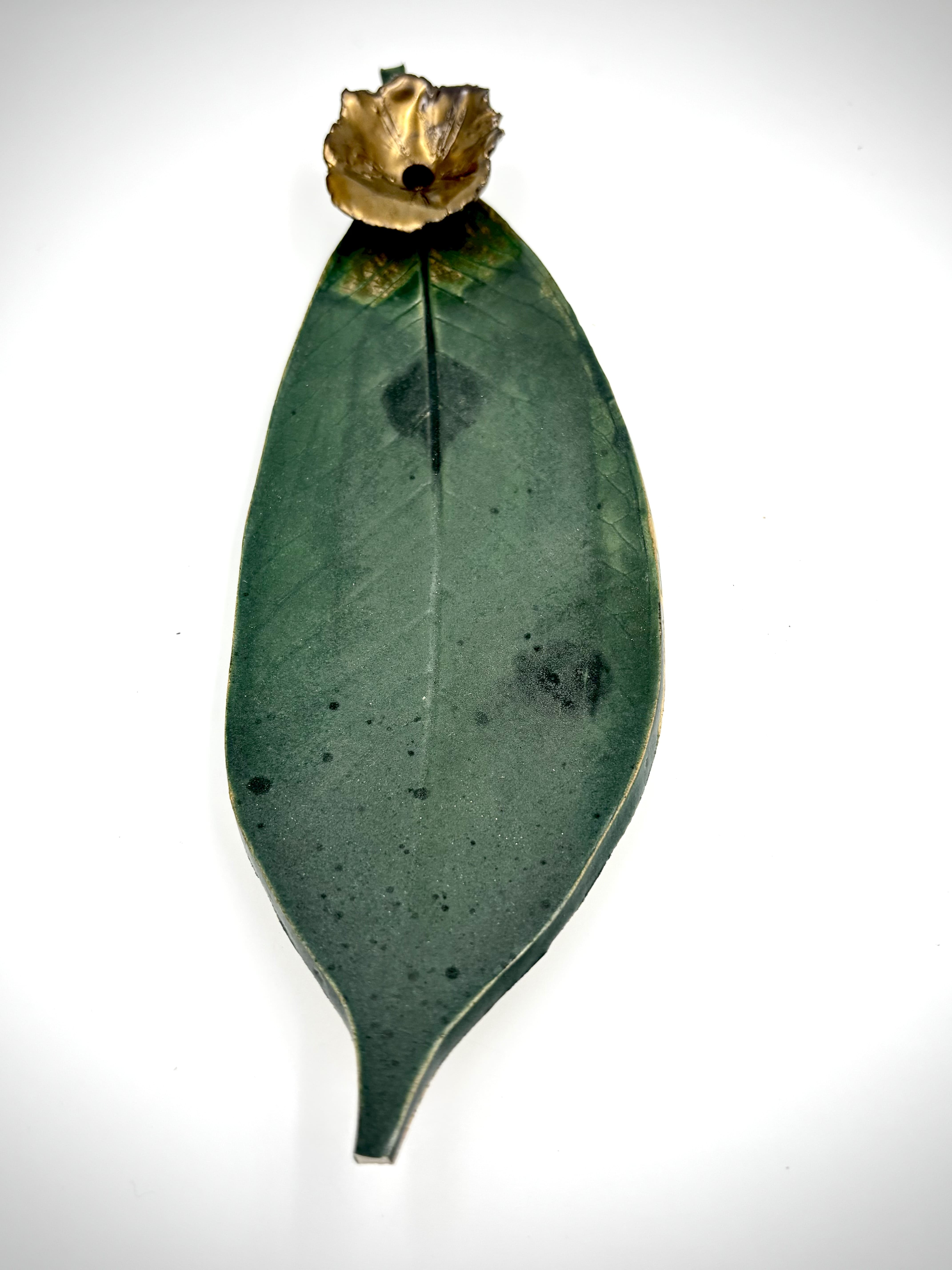 Inspired by nature's quiet elegance, this handcrafted ceramic incense holder features a lifelike green leaf with a golden bloom. Perfect for holding incense sticks or simply as a decorative accent, this piece blends artistry with functionality, bringing a touch of organic beauty to your home or meditation space.