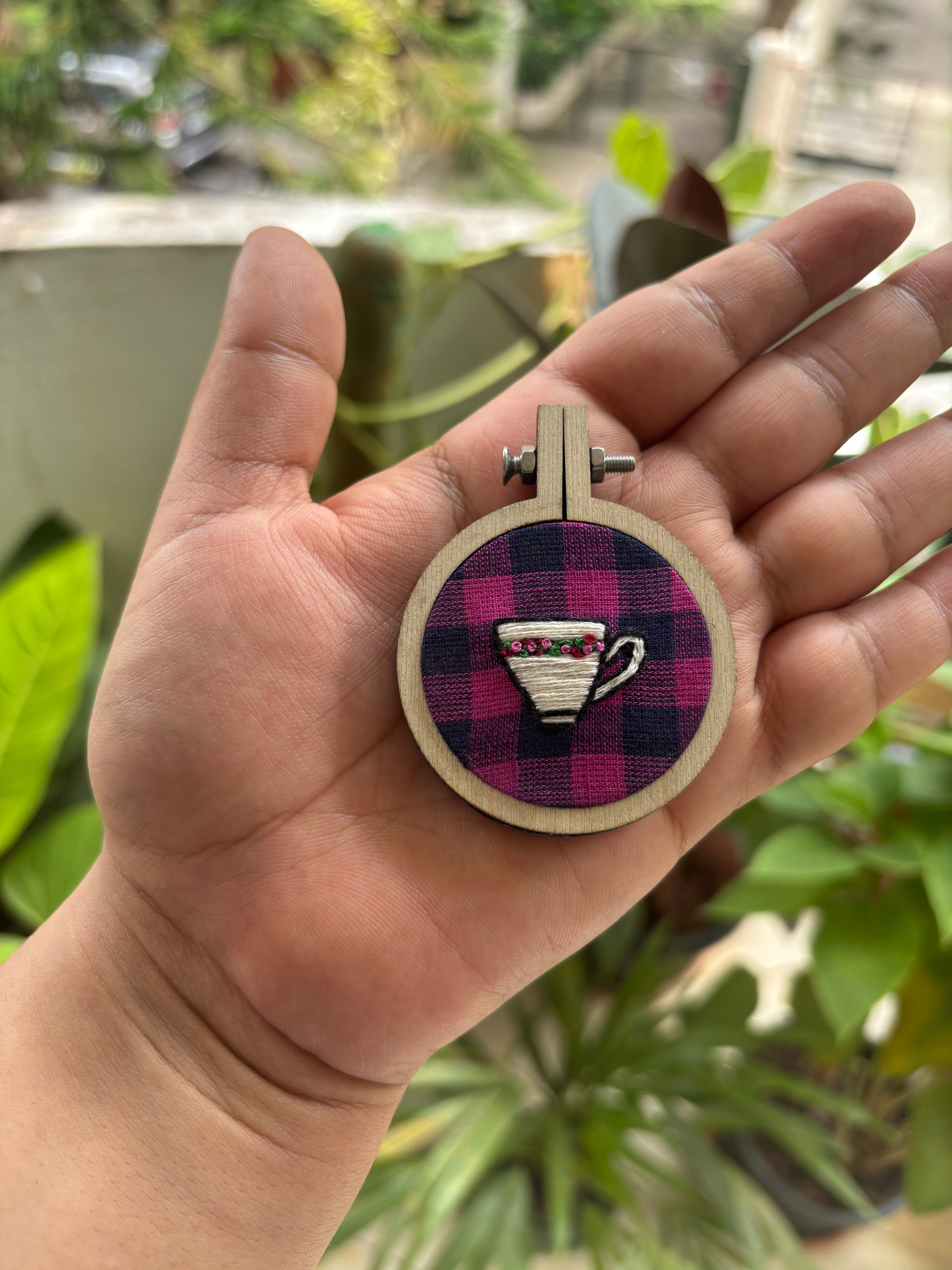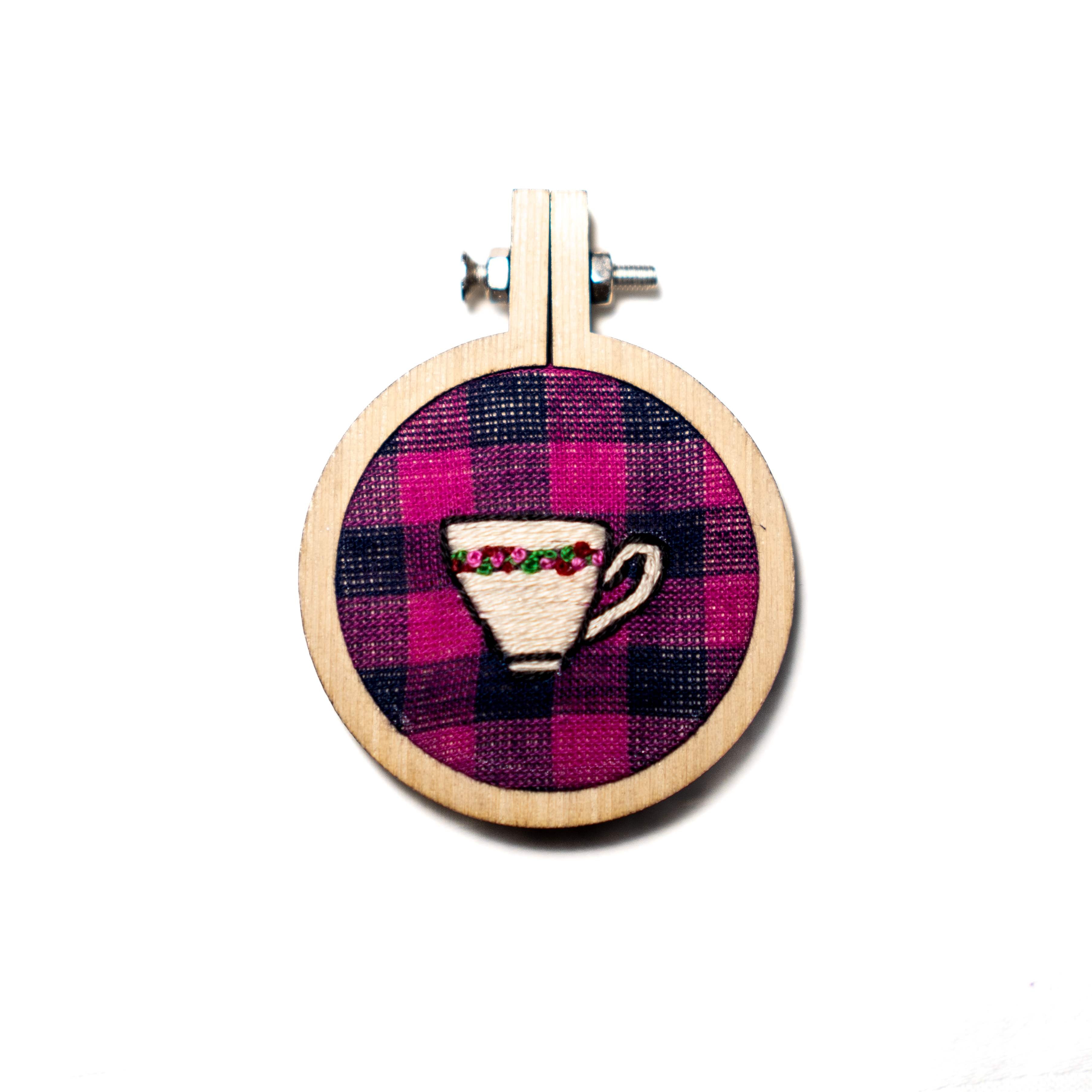 Hand embroidered vintage teacup with floral accents on Madras checks.